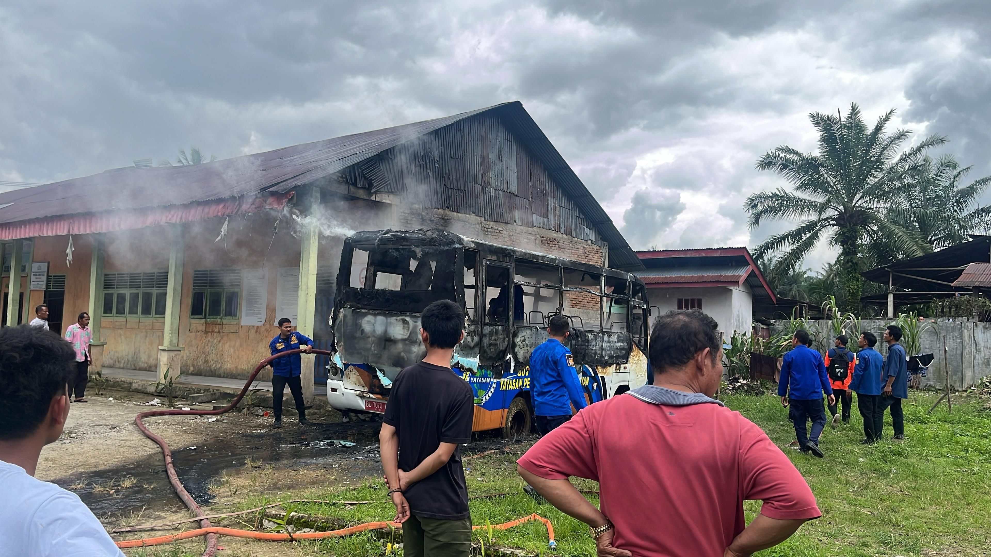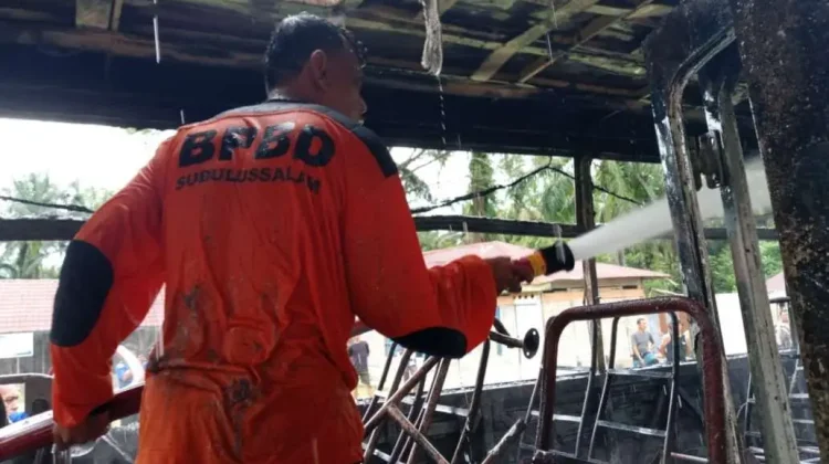 KBRN, Subulussalam : Satu unit bus sekolah hangus terbakar di halaman TK Arroyan, Desa Lae Bersih, Kecamatan Penanggalan, Kota Subulussalam. Peristiwa yang mengejutkan warga setempat ini terjadi pada Selasa (16/12/2025) siang, di mana api dengan cepat melalap bagian dalam kendaraan tersebut.