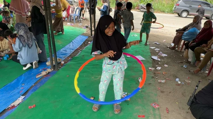 Mariani, warga pengungsian, tersenyum melihat anak-anak bahagia. “Anak-anak nyanyi, happy, tak murung lagi,” ujarnya penuh harap.