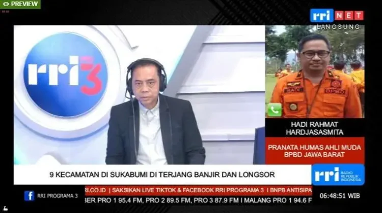 KBRN, Sukabumi: Badan Penanggulangan Bencana Daerah (BPBD) melaporkan, banjir dan longsor menimpa 17 desa di 10 kecamatan, Sukabumi, Jawa Barat (Jabar). Pranata Humas Ahli Media BPBD Jabar, Hadi Rahmat mengatakan, BPBD Sukabumi masih melakukan pendataan dampak serta bantuan diperlukan.