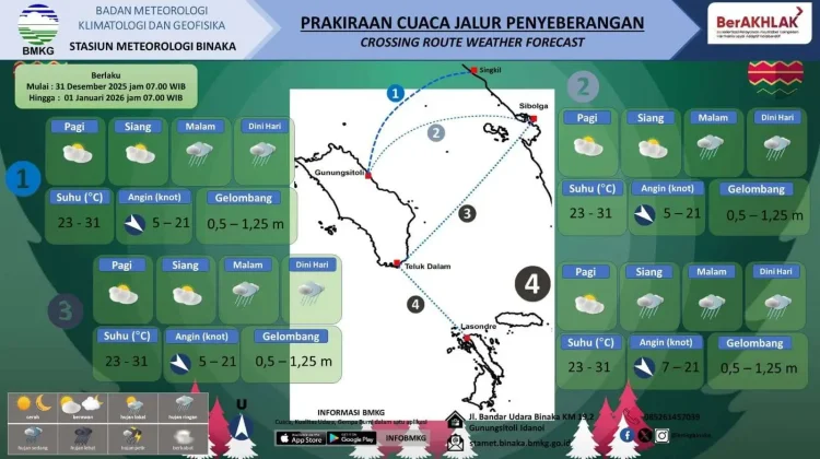 Kemudian untuk kondisi Perairan Timur Kepulauan Nias berlaku tanggal 31 Desember 2026, cuaca diprakirakan hujan ringan, angin dari Barat Laut dengan kecepatan 5-9 knot, maksimum 21 knot gelombang kategori rendah 0,5 - 1,25 meter.