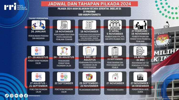KBRN, Jakarta: Pemilihan Kepala Daerah (Pilkada) 2024 akan dilakukan serentak pada 27 November mendatang. Rangkaian pelaksanaan Pilkada telah dimulai pada awal tahun 2024.