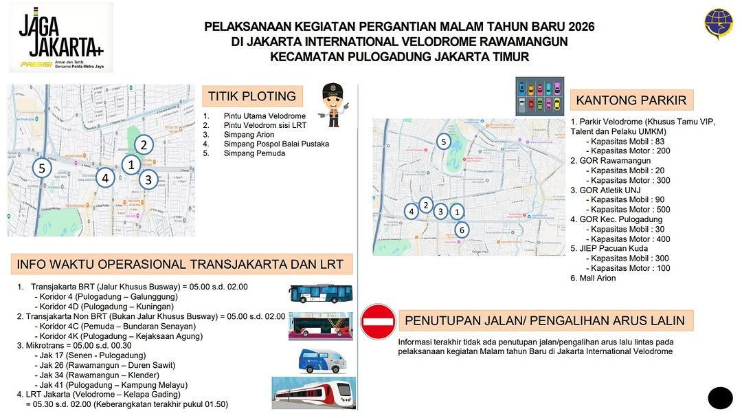 Poster denah perayaan malam tahun baru 2026 di Jakarta International Velodrome. (Foto: Suku Dinas Pariwisata dan Ekonomi Kreatif Jakarta Timur)Untuk layanan TransJakarta BRT atau jalur khusus busway, operasional berlangsung mulai pukul 05.00 hingga 02.00 WIB. Rute yang dapat dimanfaatkan antara lain Koridor 4 Pulogadung-Galunggung serta Koridor 4D Pulogadung–Kuningan.