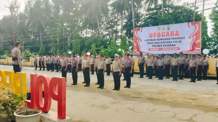 KBRN, Kaimana : Bertempat di Lapangan Apel Polres Kaimana, telah dilaksanakan upacara laporan kenaikan pangkat Perwira Pertama (Pama) dan Bintara Polri Polres Kaimana periode 1 Januari 2026, Rabu (31/12/2025). Kenaikan pangkat tersebut berdasarkan Lampiran Surat Perintah Kapolres Kaimana Nomor: SPRIN/790/XII/OTL.2.1/2025 tertanggal 29 Desember 2025. Sebanyak 37 anggota Polri Polres Kaimana dinyatakan memenuhi syarat untuk naik pangkat satu tingkat lebih tinggi.
