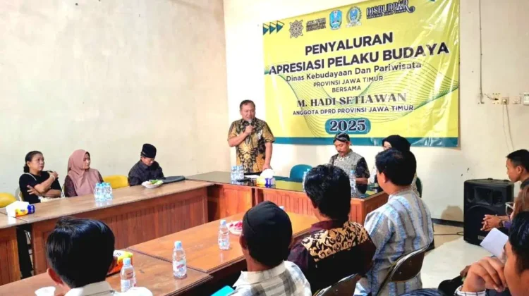 KBRN, Kediri: Anggota Komisi B DPRD Provinsi Jawa Timur, M Hadi Setiawan menyerahkan bantuan kepada sejumlah pelaku budaya dari Kota dan Kabupaten Kediri. Dalam keterangannya, Selasa (16/12/2025), Hadi Setiawan menyebutkan, penyaluran apresiasi yang berlangsung di Kantor DPD Partai Golkar Kabupaten Kediri, Jalan Pamenang, Kecamatan Ngasem pada Senin (15/12/2025) tersebut merupakan wujud kepedulian terhadap para pelestari seni dan budaya lokal di Kediri Raya.