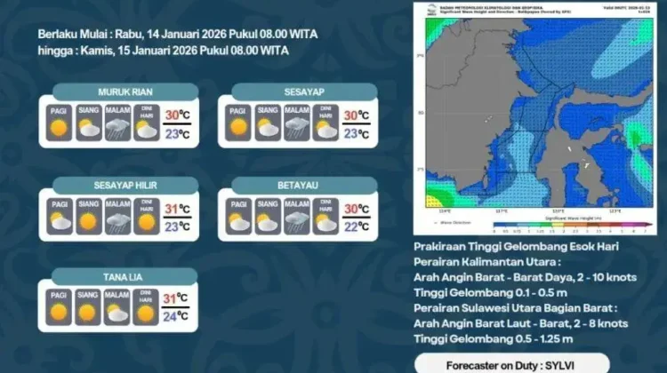 RRI.CO.ID. Malinau : Badan Meteorologi, Klimatologi, dan Geofisika (BMKG) memprakirakan cuaca di wilayah Kabupaten Tanah Tidung yang berlaku Rabu (14/01/2026) pukul 08.00 WIB hingga Kamis (15/01/2026) pukul 08.00 WIB.