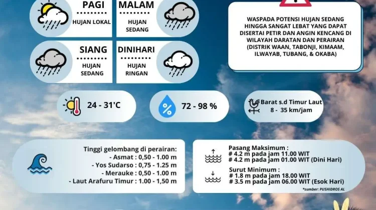 Beradasarkan rilis Stasiun Meterologi Mopah Merauke yang diterima RRI, menyatakan bahwa Peringatan Dini : Waspada potensi hujan sedang hingga lebat yang dapat disertai petir dan angin kencang di wilayah daratan dan perairan (Distrik Waan, Tabonji, Kimaam, Ilwayab Tubang dan Okaba). BMKG juga terus mengupdate prakiraan cuaca wilayah Kabupaten Merauke setiap harinya.