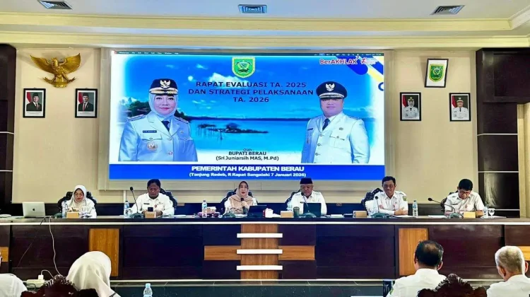KBRN, Berau: Pemerintah Kabupaten Berau menggelar Rapat Evaluasi Pelaksanaan APBD Tahun Anggaran 2025 serta Strategi Pelaksanaan APBD Tahun Anggaran 2026 di Ruang Rapat Sangalaki pada Rabu (7/1/2026). Kegiatan ini dihadiri oleh Bupati Berau, Wakil Bupati Berau, Sekretaris Daerah, para Asisten, Staf Ahli, Kepala OPD, Kepala Bagian, serta Camat se-Kabupaten Berau.