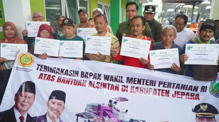 KBRN, Jepara: Pemerintah Kabupaten Jepara menyerahkan bantuan alat dan mesin pertanian (alsintan) senilai Rp7,7 miliar kepada kelompok tani, gabungan kelompok tani, dan Unit Pelayanan Jasa Alsintan (UPJA). Bantuan ini menjadi dukungan konkret Pemkab Jepara untuk meningkatkan produktivitas pertanian dan ketahanan pangan daerah.