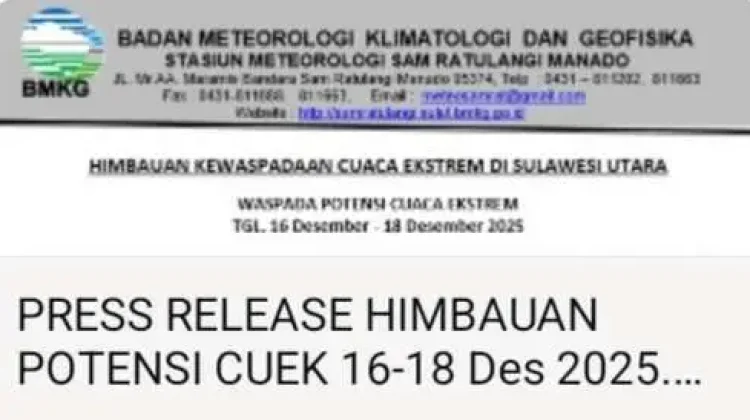 KBRN, Tahuna: Badan Meteorologi Klimatologi dan Geofisika (BMKG) Sam Ratulangi Manado menghimbau masyarakat tingkatkan kewaspadaan. Peringatan BMKG tersebut terkait potensi cuaca ekstrem yang akan terjadi 16 sampai 18 Desember 2025 disejumlah daerah termasuk Kabupaten Kepulauan Sangihe. Dimana berdasarkan analisis kondisi berbagai dinamika atmosfer hasil pantauan BMKG berbagai fenomena yang mempengaruhi cuaca di Sulawesi Utara. Terdeteksi pusat tekanan rendah yang memicu perlambatan percepatan angin yang memberikan dampak peningkatan curah hujan, La nina aktif, suhu muka laut yang lebih hangat serta kelembaban udara yang lebih basah di setiap lapisan dan tingginya Indeks labiliyaa atmosfer. Kombinasi dari fenomena tersebut membentuk kondisi atmosfer yang diprediksi akan mendukung terjadinya hujan dengan intensitas sedang hingga lebat disertai kilat, angin kencang dibeberapa kabupaten kota di Sulawesi Utara termasuk Kabupaten Kepulauan Sangihe.