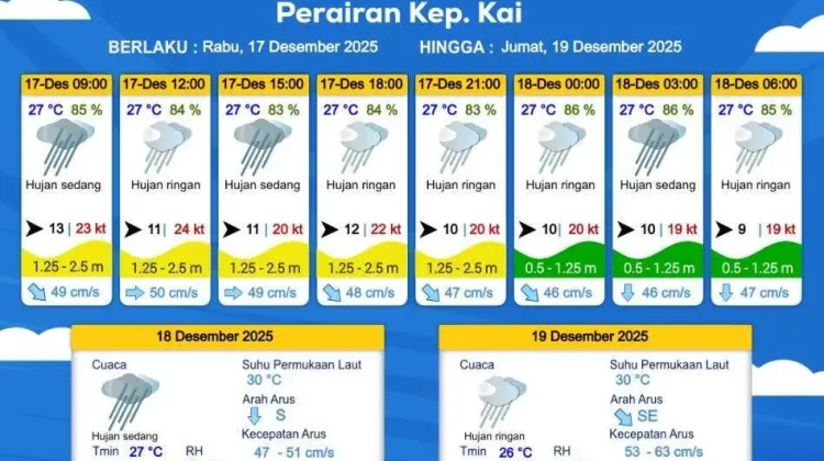 KBRN, Langgur: Prakiraan cuaca Kota Tual, Kabupaten Maluku Tenggara Kabupaten Maluku Barat Daya, Kabupaten Kepulauan Tanimbar dan Kabupaten Kepulauan Aru pada Rabu (17/12/2025) yang dihimpun rri.co.id pada Selasa (16/12/2025) sore berdasarkan hasil pengamatan Badan Meteorologi Klimatologi dan Geofisika (BMKG) Provinsi Maluku.